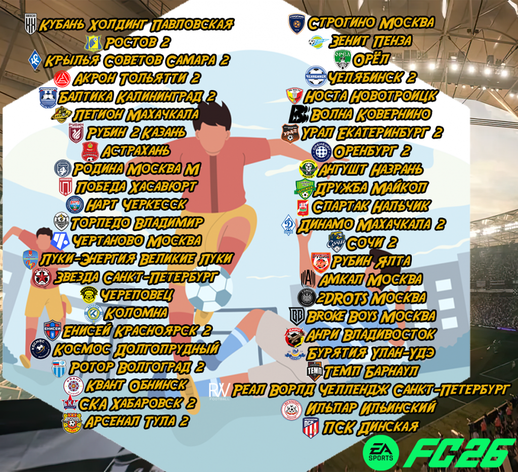 Это придуманная лига от FIFAMAN из оставшихся профессиональных команд России, а так же команд которые принимали участие в Кубке России в сезоне 25/26. Например медийные клубы Амкал, 2дротс, Броук Бойз, и экзотические Анри Владивосток или Бурятия Улан-Удэ. В этой лиге собраны 46 команд и 1221 футболистов! Сезон заканчивается на 32 турах, чтобы не создать коллапс из матчей. Всё продумано до мелочей и с особым вниманием для пользователей.