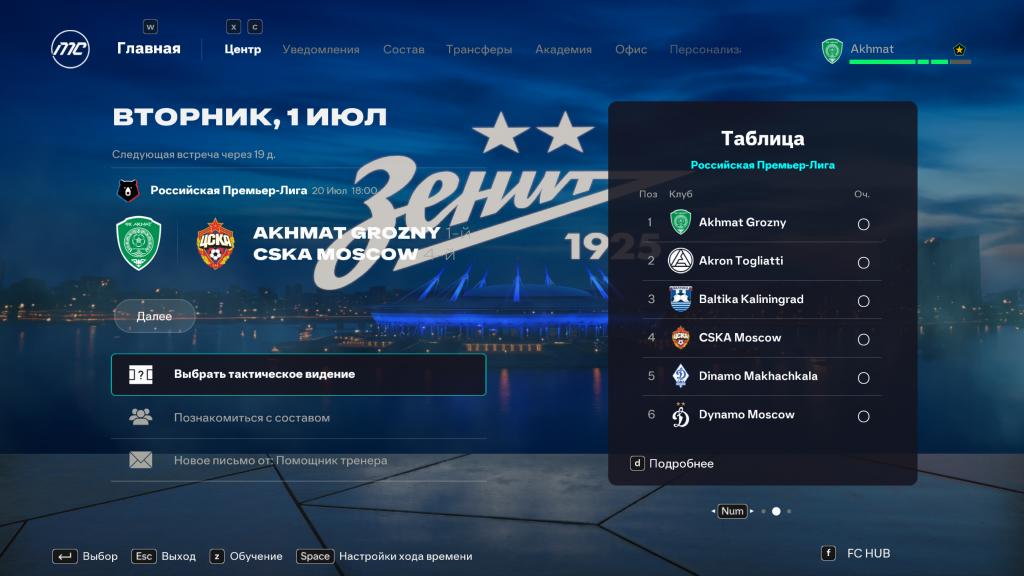 • Ожидания руководства: полностью реалистичное. В Зените от вас будут требовать выигрывать Чемпионат и хорошо показать себя в Лиге Чемпионов, а боссы Динамо из Махачкалы попросят сохранить прописку в РПЛ. И такие события прописаны всем 118 клубам. В особенности вторые команды делают максимальный упор на развитие молодежи. К примеру Зенит-2 будет максимально просить развивать молодежь и не особо смотреть на турнирные позиции.